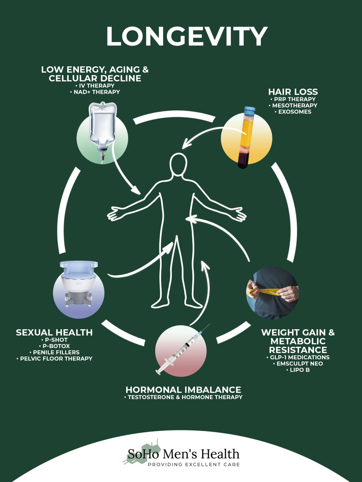 If you are ready to take a proactive, medical approach to longevity, SoHo Men’s Health offers advanced longevity treatments designed to help men live longer, stronger, and better.
