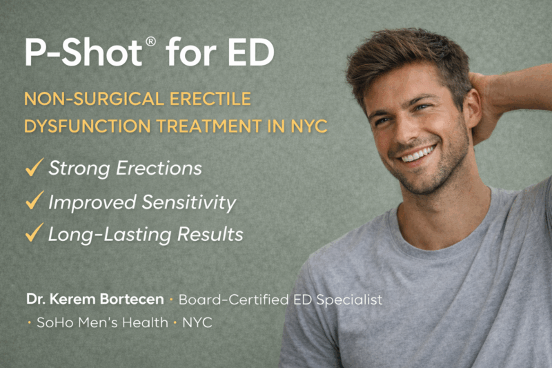 At SoHo Men’s Health in NYC, our board-certified physician Dr. Kerem Bortecen specializes in cutting-edge men’s sexual health treatments, including the P-Shot® (Priapus Shot) — a natural, minimally invasive option for improving erections, sensitivity, and sexual performance.
